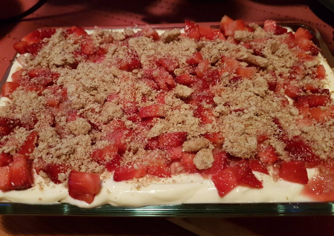 - Se sigue así, hasta terminar con fresas picadas por encima y bañadas con un poco del almíbar sobrante. Se trituran con las manos las galletas y se espolvorea por encima. Listo!!