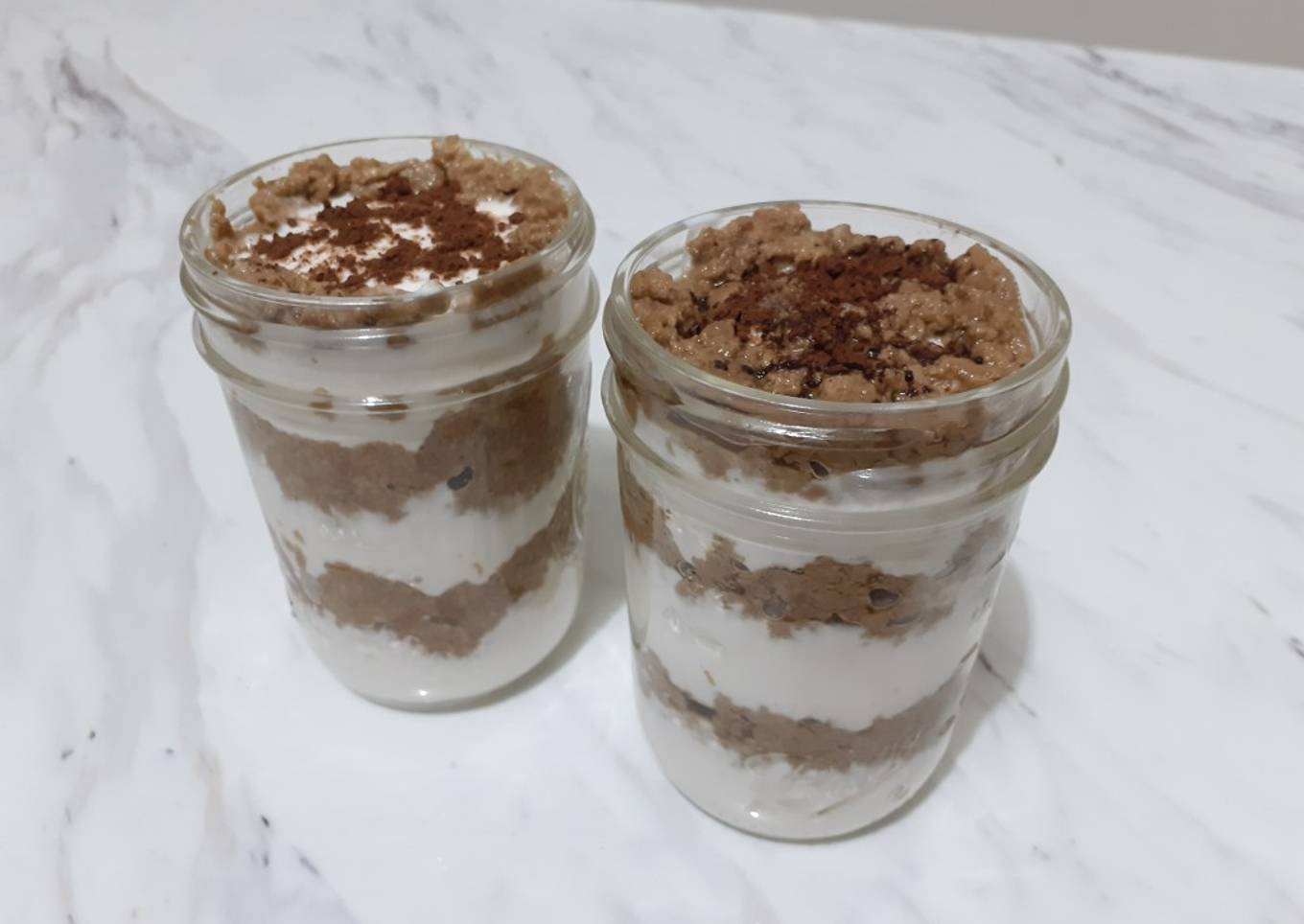- Servir en dos recipientes, hacer capas de ambas mezclas, primero una de yogurt y luego otra de galleta. La galleta debe ponerse suavemente para que no se hunda comenzando por las orillas del recipiente para que se vea bonito.