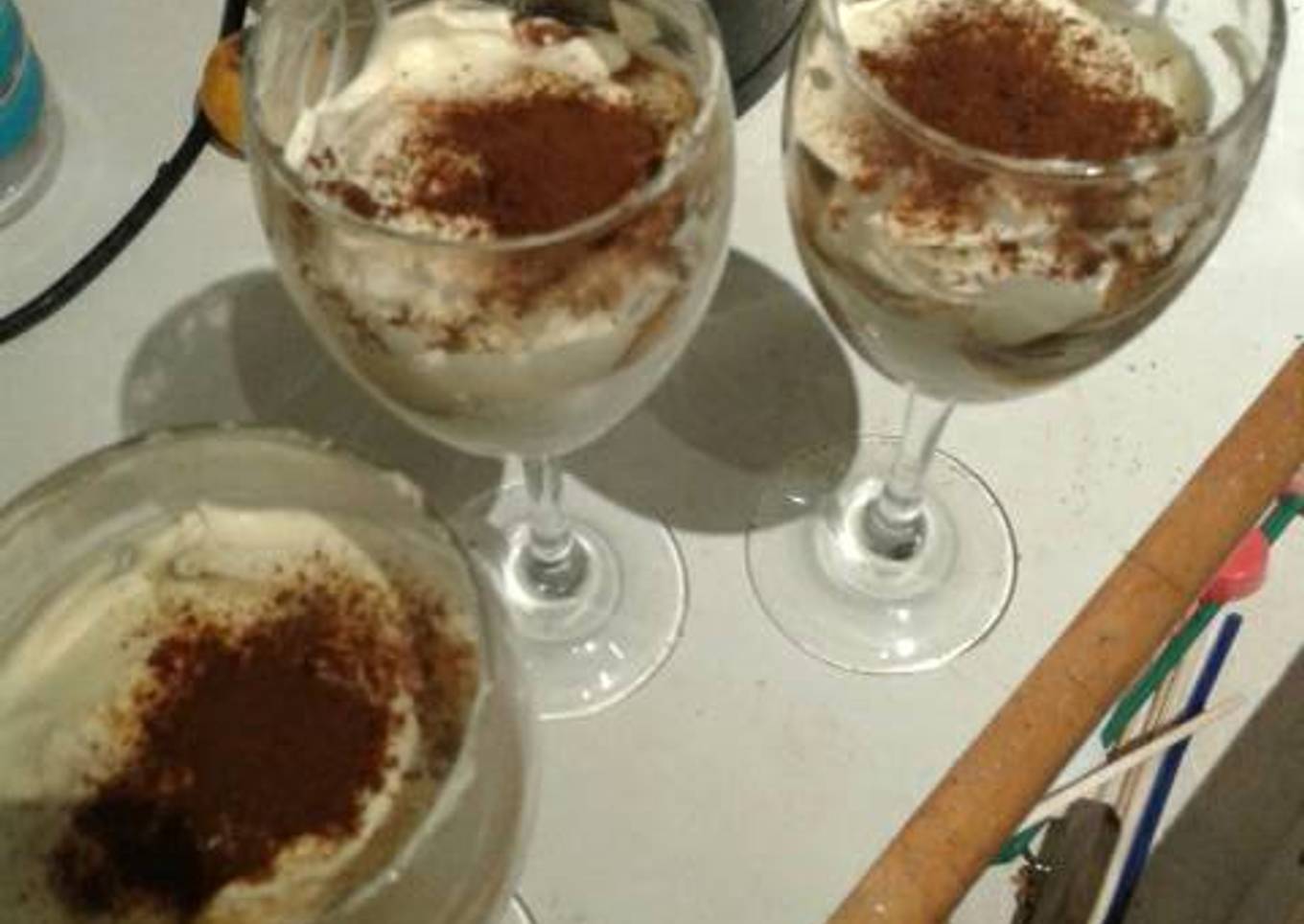 - Toma aproximadamente 100ml de leche y agrégale una cucharada chica (40gr) de cafe y mezcla hasta diluir. Toma el licor flameado y mezcla con la leche y el café Ya con esto listo es hora de armar el postre Yo lo prepare en unas copas por la presentación Primero unta bien las galletas en la mezcla de ron y queden casi que se desarmen y arma una base.