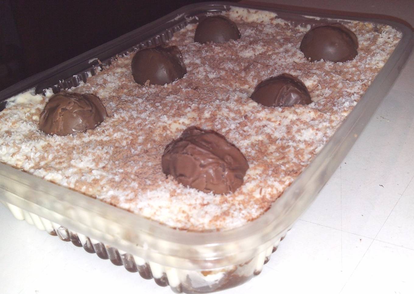 - Agregar crema batida nuevamente, el coco rallado y el cacao o chocolate rallado.