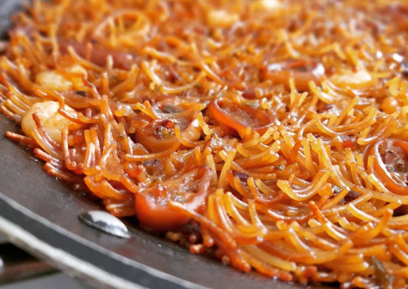 - En la paella doramos los fideos sin aceite ni nada removiendo continuamente para que no se quemen.
