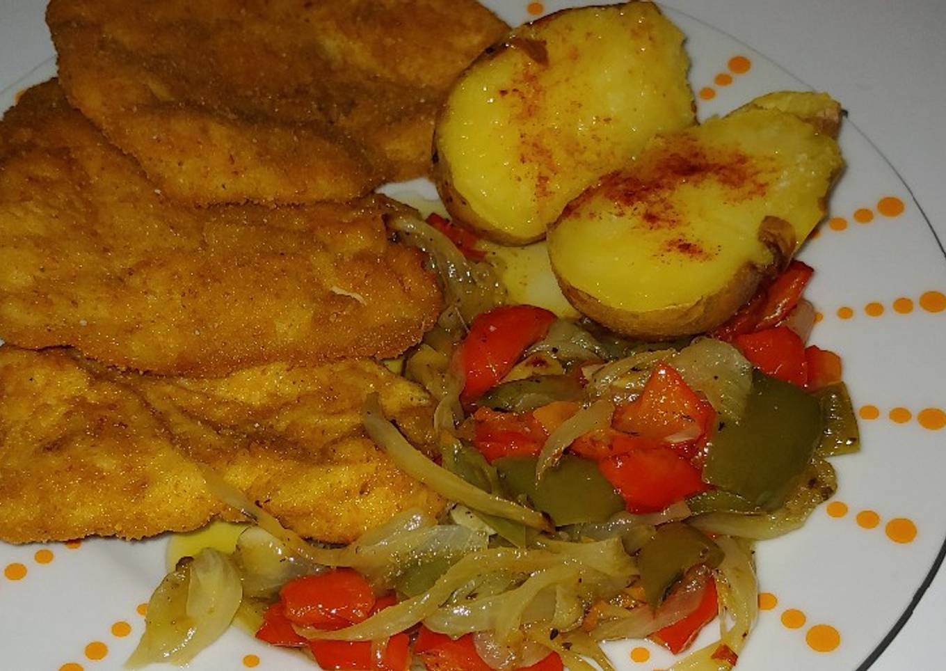 - Revisaremos las patatas con termómetro, que estén a 65 grados en su interior. Revisaremos las verduras que estén bien salteadas del horno y una vez fritos o sofritos todos los bistecs empanados adelante, plato de plano y a preparar para comer buen provecho. Espero que os guste