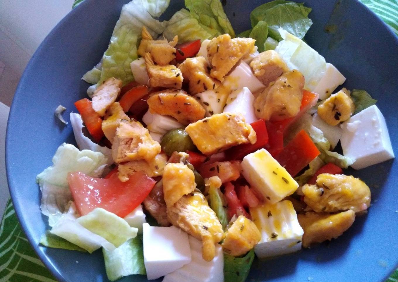 - Poner todos los ingredientes en una ensaladadera o plato, bien lavados y cortados al gusto y aliñar con sal y la salsa de la pechuga.