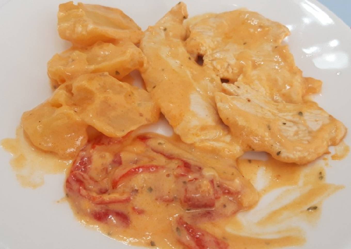 Pechugas de pollo en salsa de nata y tomate. Añade media barra de pan para mojar esa salsita tan rica.