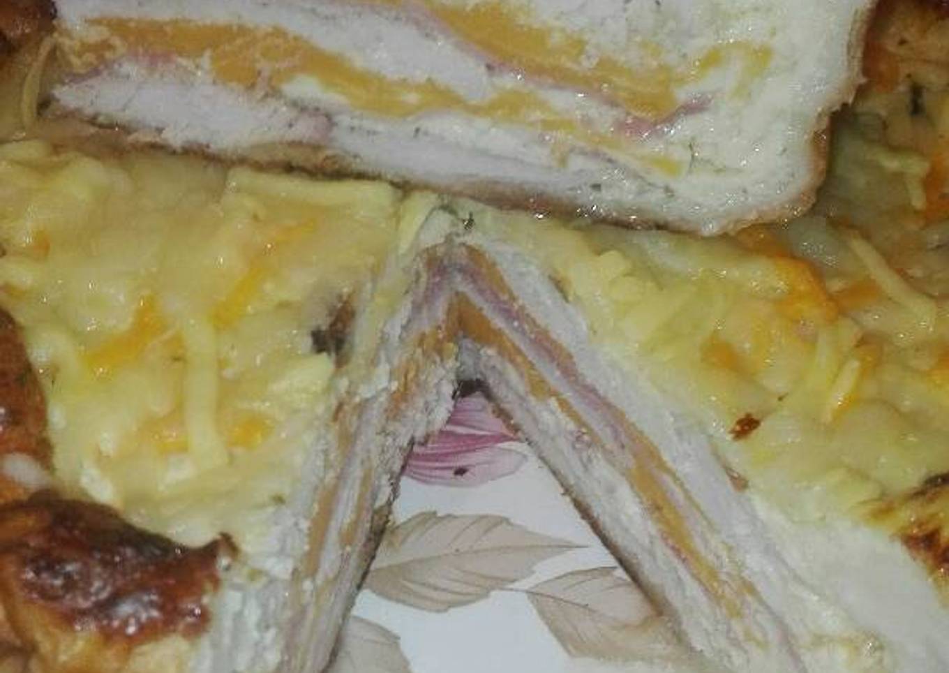 - Salpimentar los filetes de pechuga cubrimos el fondo del hojaldre con filetes de pechuga encima ponemos el beicon luego filetes a continuación jamón cocido cubrimos todo los filetes luego filetes y cubrir con las lonchas de queso y por último termina con pechuga