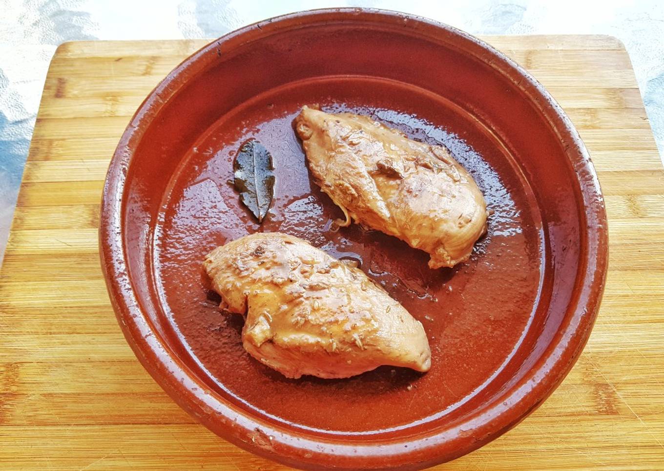 - Cortamos la pechuga en finas lonchas como si fuese fiambre, y añadimos la vinagreta por encima.